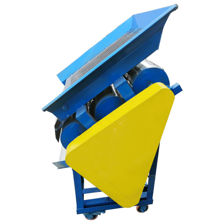 三滾筒吸鐵機(jī)主要由三個(gè)半磁滾筒,入料口、出料口、電機(jī)、主架、減速裝置等組成,物料從入料口入料,經(jīng)過三個(gè)滾筒三次磁選,使得鐵粉的純度更高,鋁/銅/塑料等其他非磁性材料從側(cè)面出,實(shí)現(xiàn)了磁性材料和非磁性材料的分離。